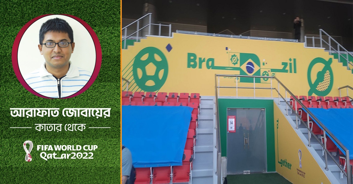 ইটের দেয়ালে দেয়ালে ব্রাজিলের পতাকা। গ্র্যান্ড হামাদ স্টেডিয়ামের সবুজ আর্টিফিশিয়াল টার্ফের সঙ্গে ব্রাজিলের পতাকা সম্বলিত সাইড বেঞ্চ। অনুশীলন ভেন্যু হলেও ম্যাচের মতোই দুইটি সাইড বেঞ্চ, যেখানে পঁচিশ পঁচিশ করে পঞ্চাশ জন বসতে পারবেন। অনুশীলন স্টেডিয়াম হলেও রয়েছে কয়েক হাজার আসন বিশিষ্ট গ্যালারী এটা। সেই গ্যালারীর এক অংশ ব্রাজিলের রঙে রঙিন।