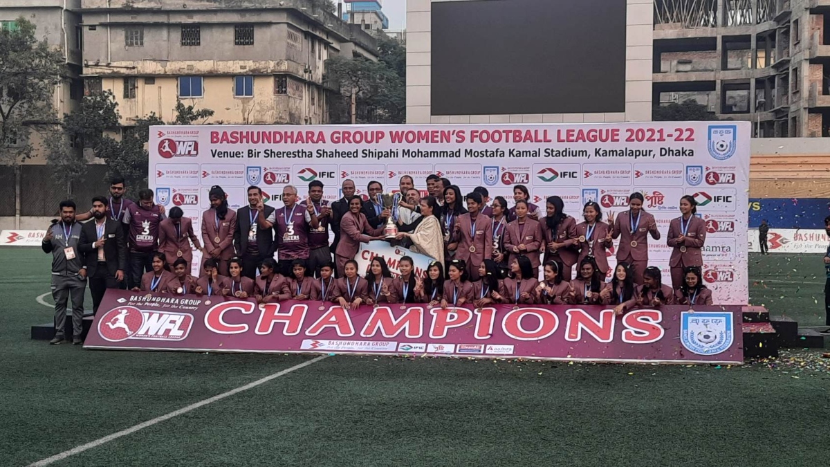 শুক্রবার ছুটির দিনেও কমলাপুর স্টেডিয়ামে জটলা। বসুন্ধরা কিংসের জার্সি পড়ে দাঁড়িয়ে রয়েছেন অনেকে। বাদ্যযন্ত্র বাজাচ্ছেন অনেকে। বসুন্ধরা কিংস ২-০ গোলে আতাউর রহমান ভুইয়া কলেজ স্পোর্টিং ক্লাবকে হারিয়ে লিগের চ্যাম্পিয়ন হয়েছে। আর তাতে পুরুষ ফুটবলের মতো নারী ফুটবল লিগেও বসুন্ধরা কিংস হ্যাটট্রিক চ্যাম্পিয়ন। নারী লিগের তিন আসরে বসুন্ধরা কিংস কোনো ম্যাচে হারেনি।