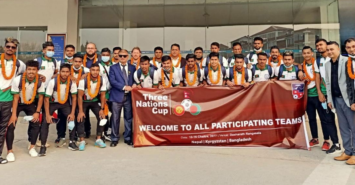 ত্রিদেশীয় আন্তর্জাতিক টুর্নামেন্ট খেলতে বাংলাদেশ জাতীয় ফুটবল দল আজ (বৃহস্পতিবার) নেপাল সময় বিকেল সোয়া চারটায় পা রেখেছে কাঠমান্ডুতে। ত্রিভূবন আন্তর্জাতিক বিমানবন্দরে বাংলাদেশ দলকে অল নেপাল ফুটবল অ্যাসোসিয়েশন (আনফা) ফুল দিয়ে বরণ করে নেয়। আনফার এই আতিথিয়েতায় বাংলাদেশ দল মুগ্ধতা প্রকাশ করেছে। বাংলাদেশ দল কাঠমান্ডু শহরের অন্যতম বড় হোটেল সলটেতে অবস্থান করছে। বাফুফে সূত্রে জানা গেছে, বাংলাদেশ দলের সবাই সুস্থ আছেন।