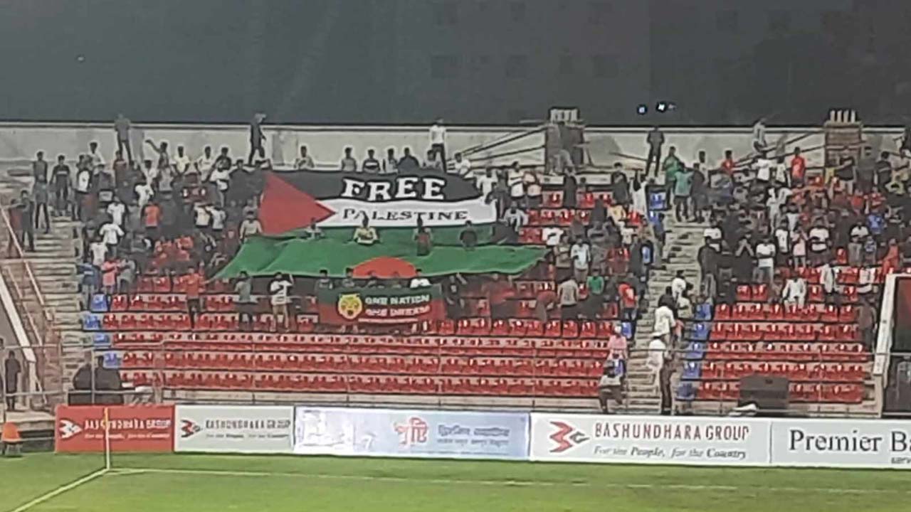 গ্যালারির এক প্রান্তে দেখা গেছে ফিলিস্তিনের বড় পতাকা। দুই দলের জাতীয় সঙ্গীতের সময় বাংলাদেশ পতাকার সঙ্গেই দেখা গেছে ফিলিস্তিনের পতাকা। যেখানে ইংরেজীতে লেখা ছিল, ‘ফ্রি প্যালেস্টাইন’।