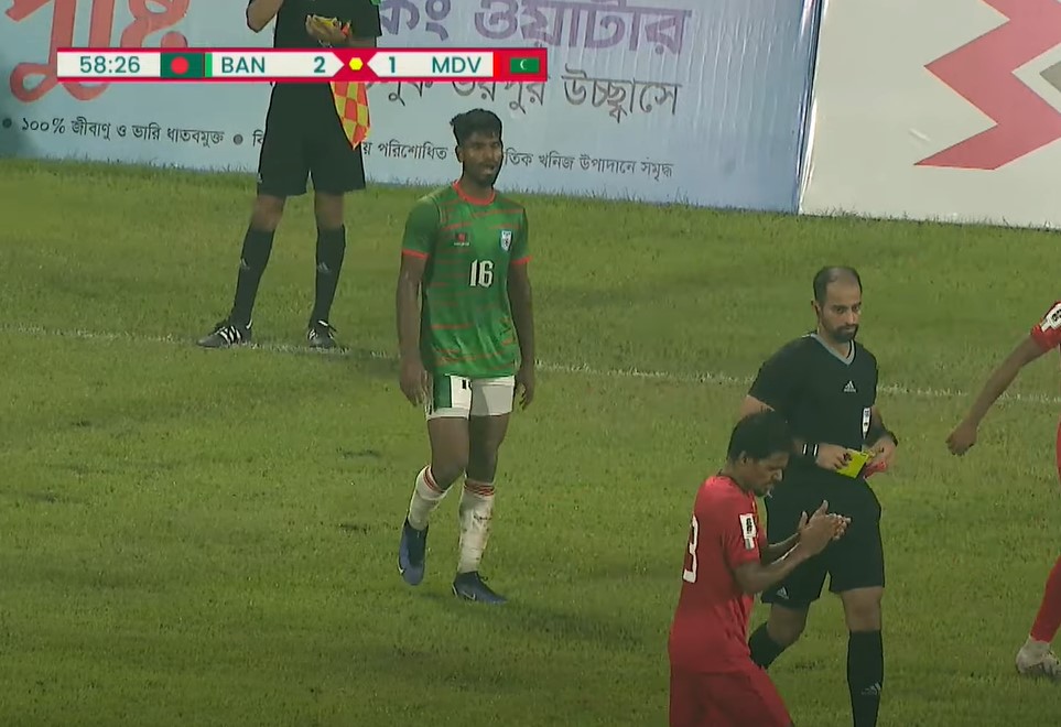 গোলদাতা রাকিব হোসেন গোলরক্ষককে একবার ১:১ এ পেয়েও বল পোস্টে রাখতে পারেননি। বাংলাদেশ ব্যবধান দ্বিগুণ করতে ব্যর্থ হলেও মালদ্বীপ সমতা আনতে ভুল করেনি। ৩৬ মিনিটে ডান প্রান্ত থেকে হাজমার কর্ণার ফাহিম হেডে ক্লিয়ার করতে পারেননি। বল আইসাম ইব্রাহিমের মাথায় পড়লে ঠান্ডা মাথায় বল জালে পাঠান। কিংস অ্যারেনার গ্যালারী নিস্তব্ধ হয়ে পড়ে।