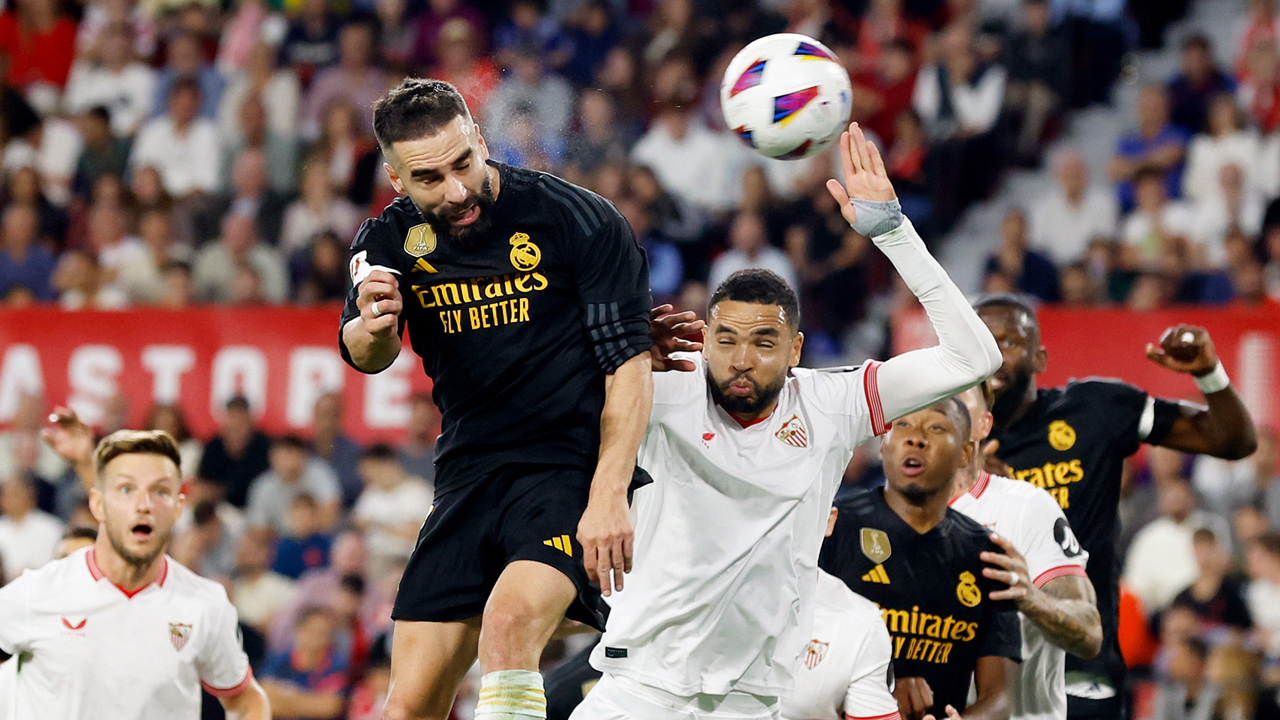 এরপর সহজ সুযোগও কাজে লাগাতে ব্যর্থ হন ভিনিসিয়ুস। মাঝমাঠের কাছাকাছি থেকে বল নিয়ে এগিয়ে বক্সের সামনে গিয়ে নিয়ন্ত্রণ হারান তিনি। ৩৪তম মিনিটে সেভিয়াকে বাঁচান রিয়ালের সাবেক অধিনায়ক সার্জিও রামোস। বাঁ-দিক থেকে টনি ক্রুসের নিচু ফ্রি-কিক বক্সে আলাবার পা ছুঁয়ে জালের দিকে যাচ্ছিল, স্লাইডে রামোস দলকে বিপদমুক্ত করেন। এরপর জুড বেলিংহ্যামকে ধাক্কা দিয়ে রামোস ফেলে দিলে দু’দল হাতাহাতিতে জড়ায়। সাবেক দুই সতীর্থ অ্যান্টোনিও রুডিগার-রামোস মুখোমুখি লড়াইয়ে গেলে অন্য খেলোয়াড়রা শান্ত করেন দুজনকে।