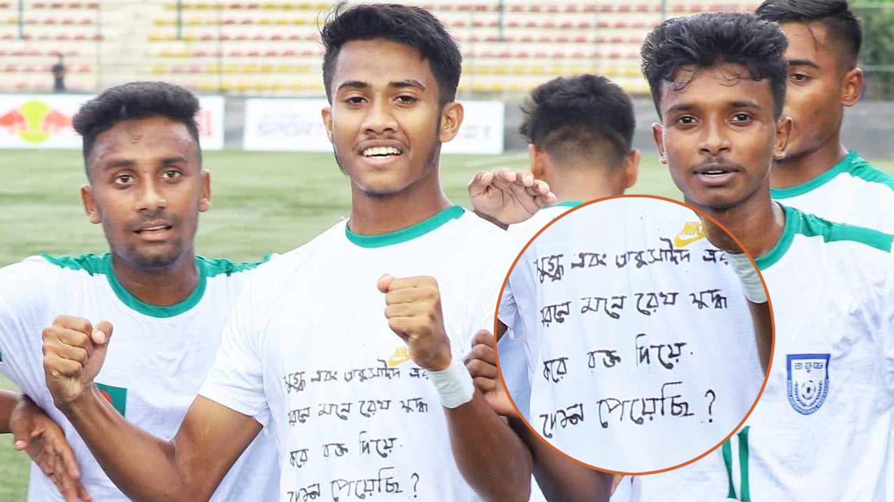 চ্যাম্পিয়নশিপে নিজেদের প্রথম ম্যাচে আজ শ্রীলঙ্কার মুখোমুখি হয়েছে বাংলাদেশ। ম্যাচের প্রথমার্ধে গোল করেই সাঈদ-মুগ্ধর নাম সংবলিত একটি টিশার্ট গায়ে চাপিয়ে উদযাপন করতে দেখা যায় ১০ নম্বর জার্সিধারী মিরাজুল ইসলামকে।