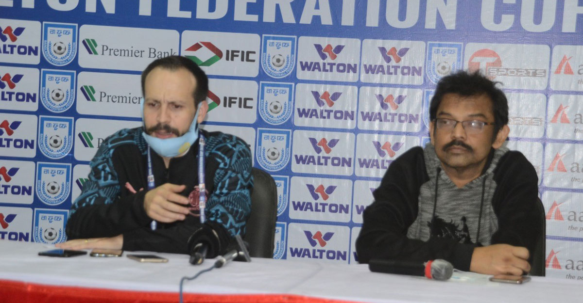 সংবাদ সম্মেলনে আবাহনীর পর্তুগীজ কোচ ম্যারিও ল্যামোস। ছবি : বাফুফে