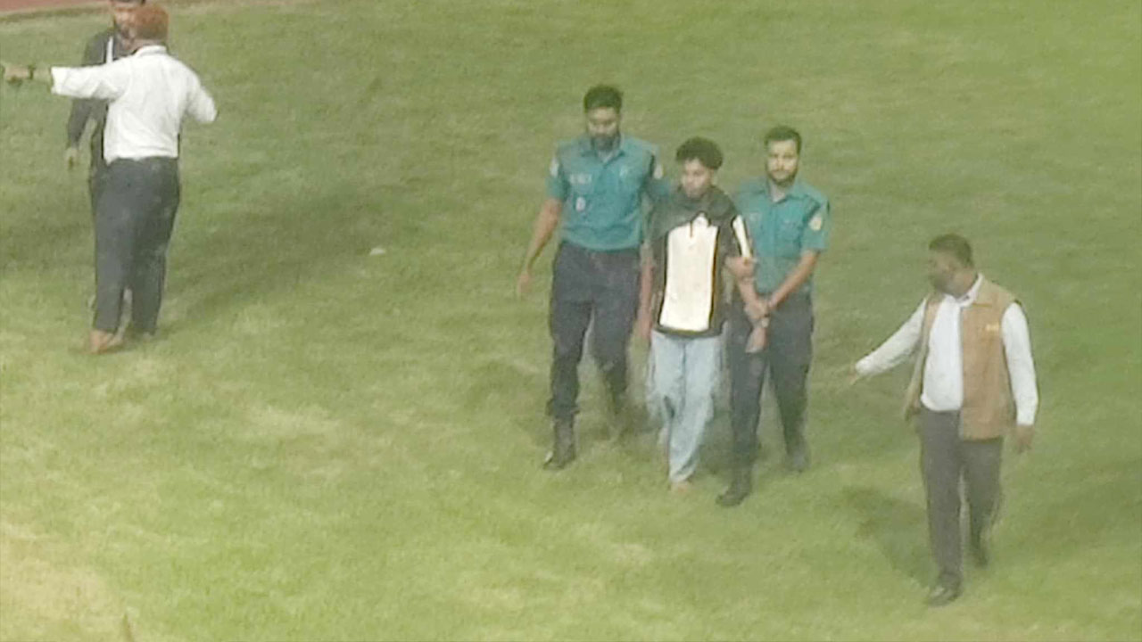 নিরাপত্তাকর্মীরা তখন সমর্থককে মাঠের বাইরে নিয়ে যান। পুলিশকে জিজ্ঞাসাবাদ করতে দেখা যায়। ঐ ঘটনার কয়েক মিনিটের মধ্যেই আবার পূর্ব পাশের গ্যালারীর সামনে থেকে একজনকে টেনে আনতে দেখা যায়। সিঙ্গাপুর ম্যাচের আগে বাফুফের এটি বাড়তি দুশ্চিন্তার কারণ।