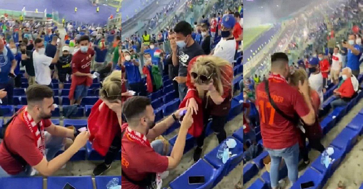 তুরস্কের এক যুবক মনের মানুষকে অব্যক্ত ভালোবাসাটা ব্যক্ত করার জন্য বেছে নিয়েছিলেন ইউরোর মঞ্চটাকেই। প্রেমিকা নিয়েই খেলা দেখতে রোমের এস্তাদিও অলিম্পিকোতে এসেছিলেন তিনি। আর তার ফাঁকেই ঘটিয়ে দিলেন সে কাণ্ডটা। খেলার মাঝে তুর্কি তরুণ হাঁটু গেড়ে বসে হাতে আংটি নিয়ে বিয়ের প্রস্তাব দেন তার গার্লফ্রেন্ডকে। তখন গোটা গ্যালারি উঠে দাঁড়িয়ে তাঁদের বিশেষ মুহূর্তটা ক্যামেরা বন্দি করতে শুরু করে দিয়েছে। বয়ফ্রেন্ডের হৃদস্পন্দন না বাড়িয়ে মেয়েটিও সঙ্গে সঙ্গে প্রস্তাবে রাজি হয়ে যায়। এরপরেই একে-অপরকে জড়িয়ে ধরেন। সেই ভিডিও রাতারাতি সামাজিক যোগাযোগ মাধ্যমে ছড়িয়েও পড়ে। সে নিয়ে আলোচনা চলছেই।