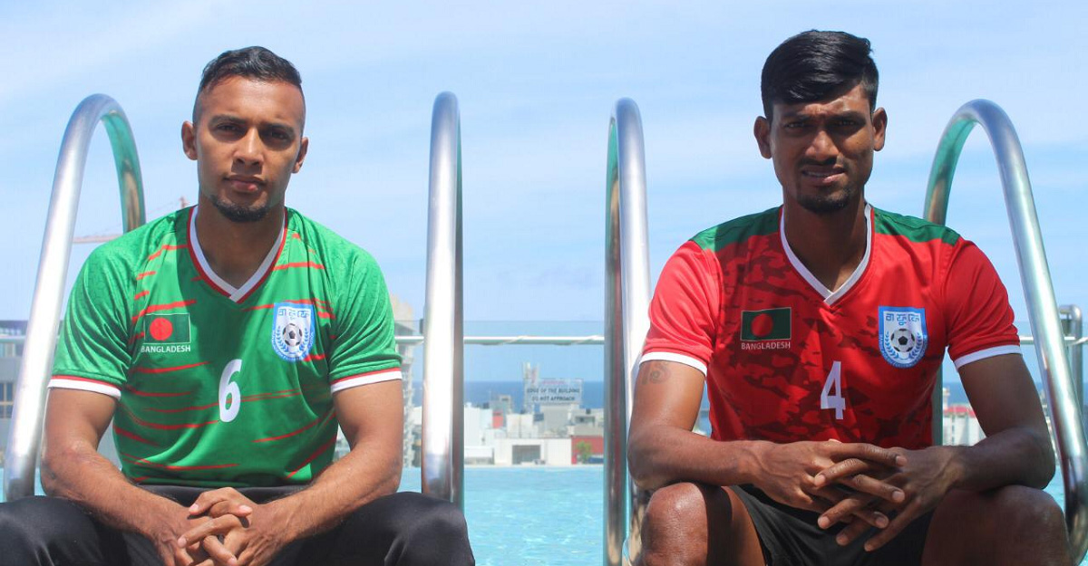 নতুন জার্সিতে বাংলাদেশ দলের অধিনায়ক জামাল ভূঁইয়া ও তপু বর্মণ/বাফুফে