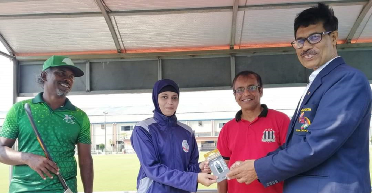বিকেএসপিতে প্রধান হকি মালয়েশিয়ান কৃষ্ণমুর্তির সামনে কোচিংয়ের বাশি রিতুর হাতে তুলে দিচ্ছেন তারিকউজজামান নান্নু/সংগৃহীত