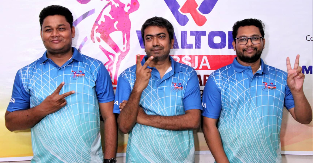 বিএসজেএ কলব্রিজের চ্যাম্পিয়ন মাহবুব আলম খান বাবু (মাঝে), রানার্স আপ তরিকুল ইসলাম সজল (ডানে) ও তৃতীয় নুর উদ্দিন/বিএসজেএ