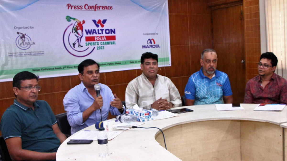 ওয়ালটন-বিএসজেএ ইনডোর স্পোর্টস কার্নিভালের আনুষ্ঠানিক সংবাদ সম্মেলন শনিবার বঙ্গবন্ধু জাতীয় স্টেডিয়ামের কনফারেন্স রুমে অনুষ্ঠিত হয়। সংবাদ সম্মেলনে উপস্থিত ছিলেন ওয়ালটন গ্রুপের জ্যেষ্ঠ নির্বাহী পরিচালক এফ.এম. ইকবাল বিন আনোয়ার ডন, বিএসজেএ সভাপতি এটিএম সাইদুজ্জামান, সাধারণ সম্পাদক আনিসুর রহমান পল্টু, টুর্নামেন্ট কমিটির আহ্বায়ক রায়হান আল মুঘনি, সদস্য সচিব রবিউল ইসলামসহ ক্রীড়া সাংবাদিকরা।