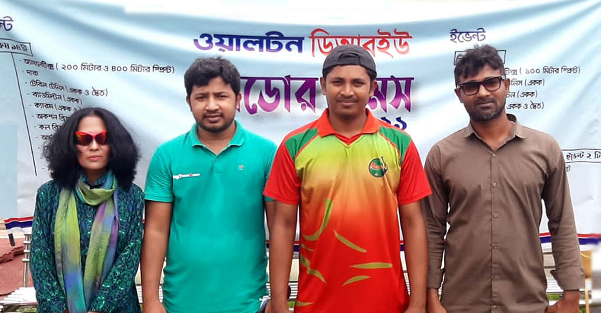 ডিআরইউ ক্রীড়া উৎসবের গোলক নিক্ষেপ ইভেন্টে চ্যাম্পিয়ন জ্যোতির্ময় মন্ডল (ডান থেকে দ্বিতীয়)