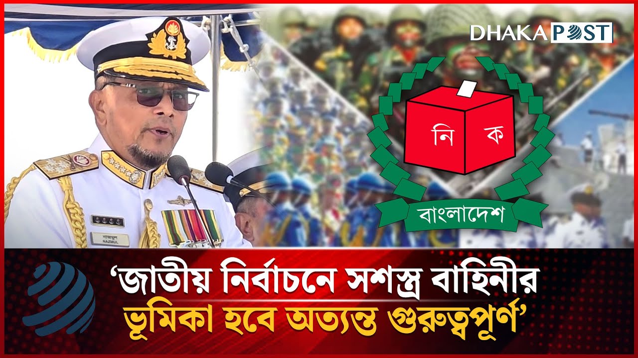 নৌবাহিনী প্রধান অ্যাডমিরাল মোহাম্মদ নাজমুল হাসান বলেছেন, আসন্ন জাতীয় সংসদ নির্বাচনে সশস্ত্র বাহিনীর ভূমিকা হবে অত্যন্ত গুরুত্বপূর্ণ। অবাধ, সুষ্ঠু ও নিরপেক্ষ নির্বাচন আয়োজনে সরকার ও নির্বাচন কমিশনকে বাংলাদেশ নৌবাহিনী সার্বিক সহযোগিতা করবে, ইনশাআল্লাহ।