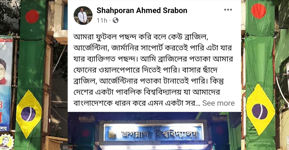 বিশ্ববিদ্যালয়ের ইসলামিক স্টাডিজ বিভাগের শাহ পরাণ নামের এক শিক্ষার্থী ঢাকা পোস্টকে বলেন, আমরা ফুটবল পছন্দ করি বলেই কেউ ব্রাজিল, আর্জেন্টিনা, জার্মানির সাপোর্ট করতেই পারি, এটা যার যার ব্যক্তিগত পছন্দ। আমি ব্রাজিলের পতাকা আমার ফোনের ওয়ালপেপারে দিতেই পারি। বাসার ছাদে ব্রাজিল, আর্জেন্টিনার পতাকা টানাতেই পারি। কিন্তু দেশের একটা পাবলিক বিশ্ববিদ্যালয় যা আমাদের বাংলাদেশকে ধারণ করে এমন একটা সরকারি প্রতিষ্ঠানের মেইন গেইটে কিভাবে ভিনদেশের পতাকায় সয়লাভ করে গেইট সাজাই! হোক সেটা ব্রাজিল, আর্জেন্টিনা, জার্মানি, ইন্ডিয়া, পাকিস্তান! এটা তো কোনো বিয়ের গেইট না যে যা মন চায় তাই করলাম! আমাদের সুবুদ্ধি, সুচিন্তার উদয় হোক।