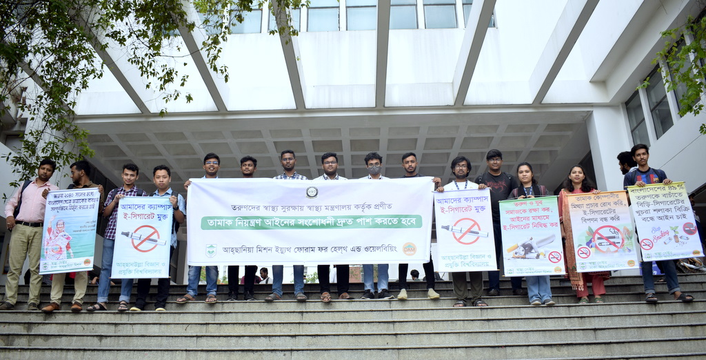 তরুণ সমাজকে ই-সিগারেট ও তামাকের করাল থাবা থেকে রক্ষা করতে হলে সংশোধিত খসড়া তামাক নিয়ন্ত্রণ আইনটি দ্রুত পাশের দাবি জানিয়েছেন আহছানউল্লাহ্ বিজ্ঞান ও প্রযুক্তি বিশ্ববিদ্যালয়ের (আবিপ্রবি) শিক্ষার্থীরা। ‘আহ্ছানিয়া মিশন ইয়ুথ ফোরাম ফর হেলথ অ্যান্ড ওয়েলবিয়িং’-এর সদস্যরা। এসময় বিশ্ববিদ্যালয় ক্যাম্পাসকে সব প্রকার তামাকসহ ই-সিগারেটমুক্ত ঘোষণা করেন বিশ্ববিদ্যালয়ের উপাচার্য প্রফেসর ড. মুহাম্মদ ফজলী ইলাহী।
