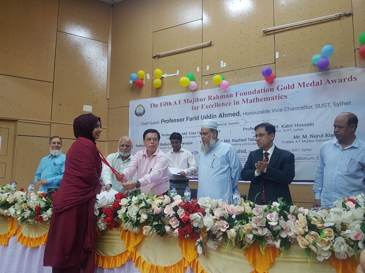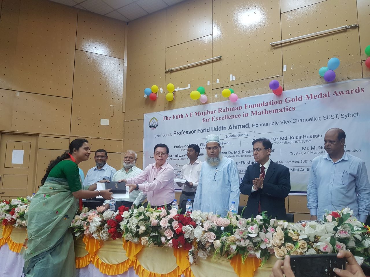 শাহজালাল বিজ্ঞান ও প্রযুক্তি বিশ্ববিদ্যালয়ের ((শাবিপ্রবি)) গণিত বিভাগের স্নাতক (সম্মান) ও স্নাতকোত্তর পরীক্ষায় কৃতিত্বপূর্ণ ফল করায় এ এফ মুজিবুর রহমান স্বর্ণপদক পেয়েছেন ১১ জন শিক্ষার্থী। মঙ্গলবার (১ আগস্ট) দুপুরে বিশ্ববিদ্যালয়ের মিনি অডিটোরিয়ামে বিশ্ববিদ্যালয়ের উপাচার্য অধ্যাপক ফরিদ উদ্দীন আহমেদ প্রধান অতিথি হিসেবে উপস্থিত হয়ে শিক্ষার্থীদের হাতে স্বর্ণপদক ও সনদপত্র তুলে দেন।