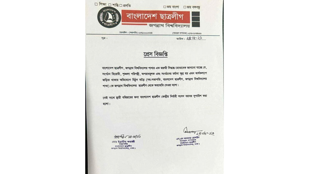 বিজ্ঞপ্তিতে বলা হয়, সংগঠনবিরোধী, শৃঙ্খলা পরিপন্থি, অপরাধমূলক এবং সংগঠনের মর্যাদা ক্ষুণ্ণ হয় এমন কার্যকলাপে জড়িত থাকার অভিযোগে মিঠুন বাড়ৈকে জগন্নাথ বিশ্ববিদ্যালয় ছাত্রলীগ থেকে অব্যাহতি দেওয়া হলো। সেই সঙ্গে স্থায়ী বহিষ্কারের জন্য বাংলাদেশ ছাত্রলীগ কেন্দ্রীয় নির্বাহী সংসদ বরাবর সুপারিশ করা হলো।