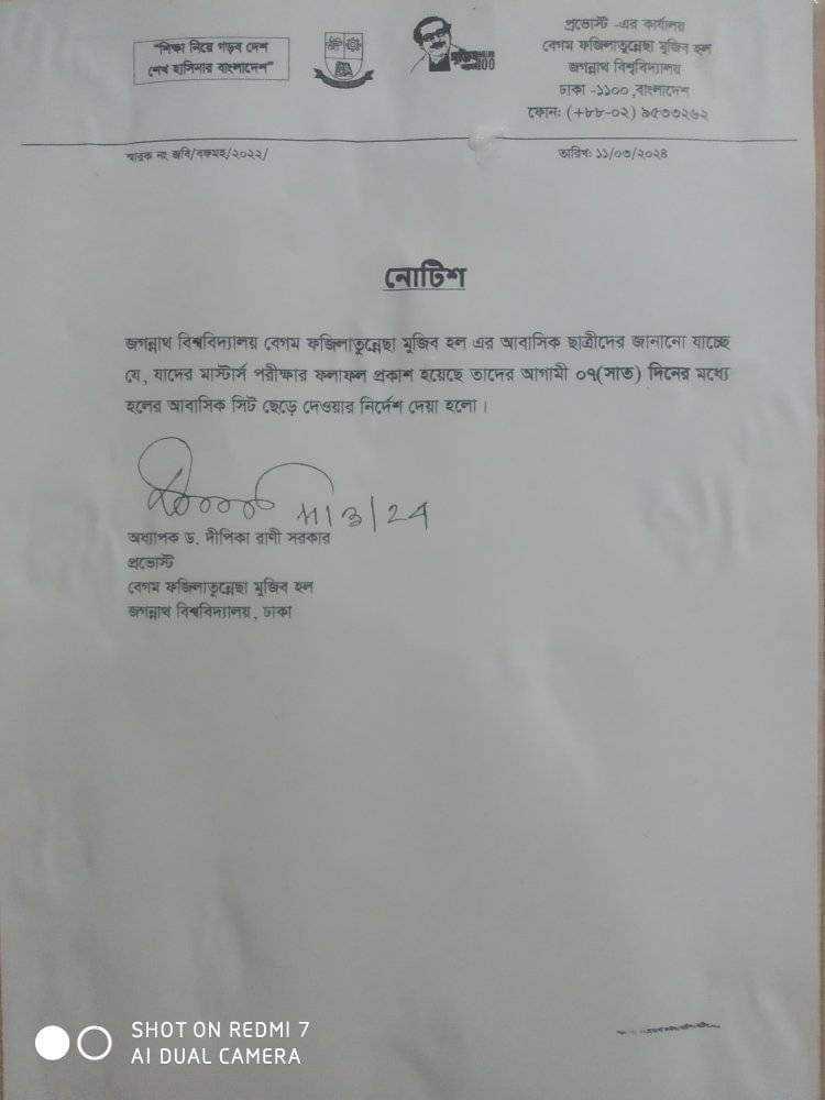 বিজ্ঞপ্তিতে বলা হয়, ‘জগন্নাথ বিশ্ববিদ্যালয় বেগম ফজিলাতুন্নেছা মুজিব হল এর আবাসিক ছাত্রীদের জানানো যাচ্ছে যে, যাদের মাস্টার্স পরীক্ষার ফলাফল প্রকাশ হয়েছে তাদের আগামী ০৭ (সাত) দিনের মধ্যে হলের আবাসিক সিট ছেড়ে দেওয়ার নির্দেশ দেওয়া হলো।’