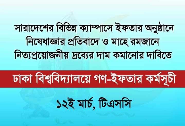 মঙ্গলবার (১২ মার্চ) রমজানের প্রথম দিন বিশ্ববিদ্যালয়ের ছাত্র শিক্ষক কেন্দ্রে (টিএসসি) এই গণ-ইফতার কর্মসূচি পরিচালিত হবে। গতকাল রাতে শিক্ষার্থীদের পক্ষ থেকে এই তথ্য নিশ্চিত করা হয়। এছাড়া কর্মসূচিতে রমজানে নিত্যপ্রয়োজনীয় দ্রব্যের দাম কমানোর দাবিও থাকবে বলে জানানো হয়।