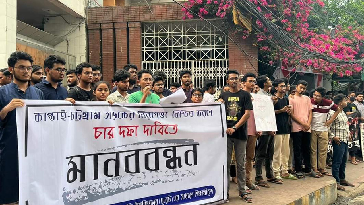 চট্টগ্রাম-কাপ্তাই সড়কে নিরাপত্তা নিশ্চিত করতে মানববন্ধন করেছে চট্টগ্রাম প্রকৌশল ও প্রযুক্তি বিশ্ববিদ্যালয়ের (চুয়েট) সাধারণ শিক্ষার্থীরা। বৃহস্পতিবার (২ মে) বিকেল ৪টার দিকে চট্টগ্রাম প্রেসক্লাবের সামনে মানববন্ধনটি আয়োজন করেন তারা। এ সময় চট্টগ্রাম জেলা প্রশাসন ও সড়ক বিভাগের উদ্দেশ্য তারা কয়েকটি দাবি পেশ করেন।
