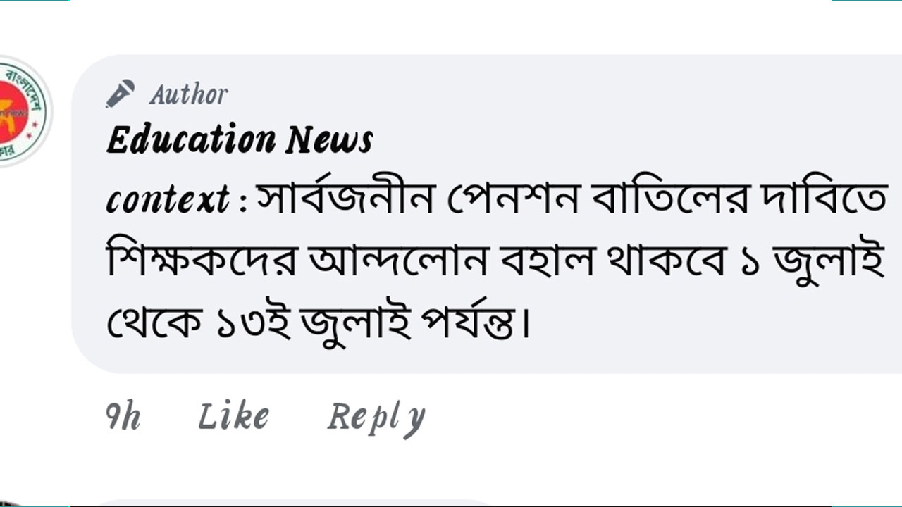 প্রকাশিত খবরের কনটেক্সট হিসেবে কমেন্টে বলা হয়, ‘সর্বজনীন পেনশন বাতিলের দাবিতে শিক্ষকদের আন্দোলন বহাল থাকবে ১ জুলাই থেকে ১৩ জুলাই পর্যন্ত।’