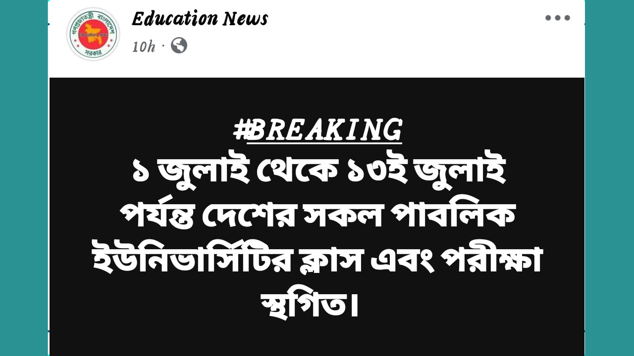 পোস্টে বলা হয়, ‘১ জুলাই থেকে ১৩ জুলাই পর্যন্ত দেশের সব পাবলিক ইউনিভার্সিটির ক্লাস এবং পরীক্ষা স্থগিত।’