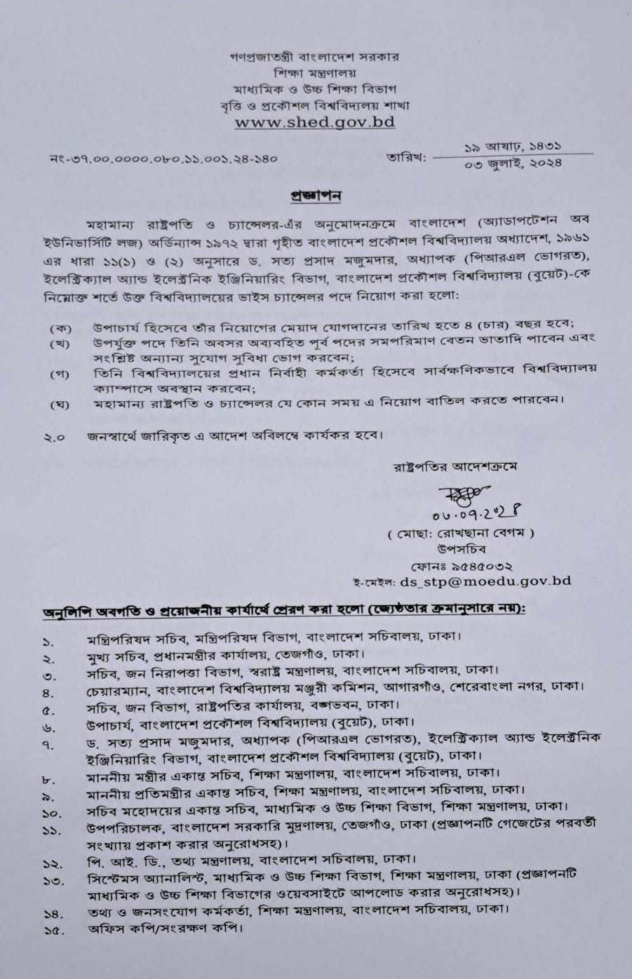 প্রজ্ঞাপনে বলা হয়, রাষ্ট্রপতি ও চ্যান্সেলর-এর অনুমোদনক্রমে বাংলাদেশ (অ্যাডাপটেশন অব ইউনিভার্সিটি লজ) অর্ডিন্যান্স ১৯৭২ দ্বারা গৃহীত বাংলাদেশ প্রকৌশল বিশ্ববিদ্যালয় অধ্যাদেশ, ১৯৬১ এর ধারা ১১(১) ও (২) অনুসারে ড. সত্য প্রসাদ মজুমদার, অধ্যাপক (পিআরএল ভোগরত), ইলেক্ট্রিক্যাল অ্যান্ড ইলেক্ট্রনিক ইঞ্জিনিয়ারিং বিভাগ, বাংলাদেশ প্রকৌশল বিশ্ববিদ্যালয় (বুয়েট)-কে নিম্নোক্ত শর্তে উক্ত বিশ্ববিদ্যালয়ের ভাইস চ্যান্সেলর পদে নিয়োগ করা হলো।”