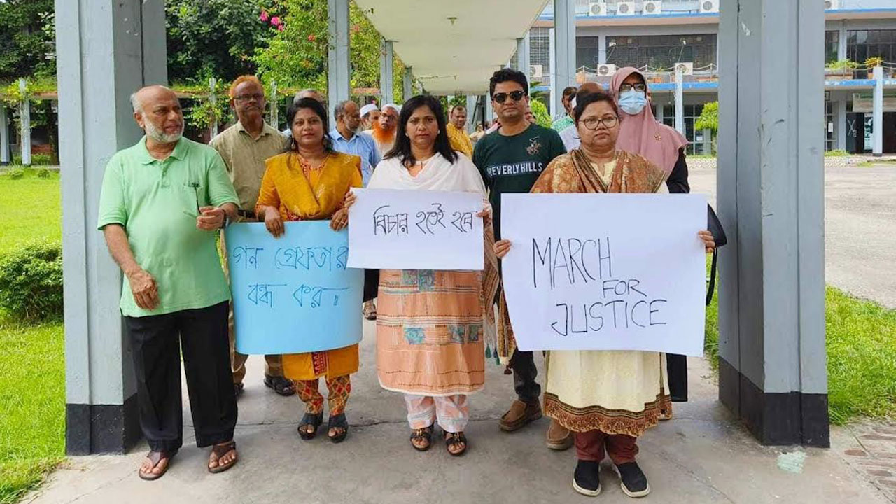 গণগ্রেপ্তার বন্ধ করো, মার্চ ফর জাস্টিস, বিচার হতেই হবে, অবিলম্বে শিক্ষাপ্রতিষ্ঠান খুলে দাও এবং স্টুডেন্টস ব্লাড ম্যাটারসহ বিভিন্ন লেখা সম্বলিত প্ল্যাকার্ড দেখা যায় শিক্ষকবৃন্দের হাতে। পরে তারা বিশ্ববিদ্যালয়ের প্রশাসনিক ভবনের সামনে থেকে প্ল্যাকার্ড হাতে একটি র্যালি বের করেন। বিশ্ববিদ্যালয়ের শহীদ মিনারে গিয়ে র্যালিটি শেষ হয়। পরে সেখানে ন্যায়বিচার, শিক্ষার অনুকূল পরিবেশ এবং নিহতদের জন্য দোয়া করা হয়।