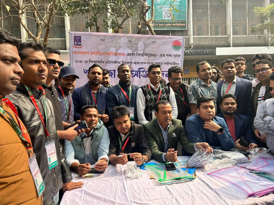 ঢাকা বিশ্ববিদ্যালয়ের কলা, আইন ও সামাজিক বিজ্ঞান ইউনিটের ২০২৪-২০২৫ শিক্ষাবর্ষে ভর্তি পরীক্ষায় অংশগ্রহণকারী শিক্ষার্থীদের সহায়তা করতে পাশে দাঁড়িয়েছে বিশ্ববিদ্যালয় শাখা ছাত্রদল।