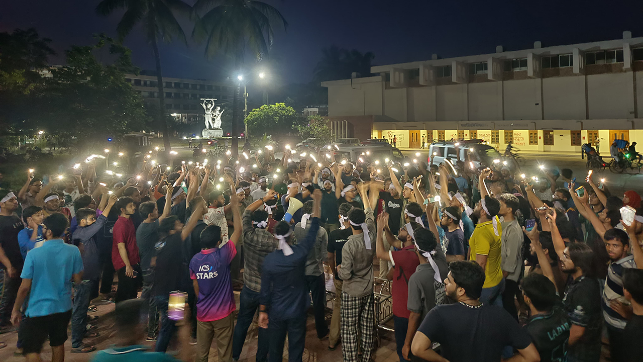এ সময় ‘আমার ভাই মরছে, ভিসি কেন হাসছে’, ‘আমার ভাই শয্যায়, ভিসি কেন ক্ষমতায়’, ‘দেখ ভিসি চোখ খুলে, আমরা গুটিকয়েক নারে’, ‘এক-দুই-তিন-চার, ভিসি তুই গদি ছাড়’, ‘আমার ভাই অনশনে, ভিসি কেন নিজ আসনে’সহ বিভিন্ন স্লোগান দেন শিক্ষার্থীরা।