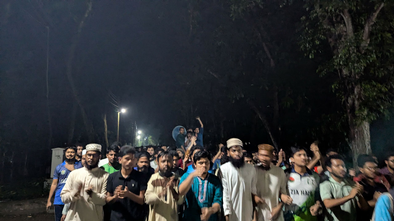 গতকাল রোববার সন্ধ্যা সাড়ে ৭টায় বিশ্ববিদ্যালয়ের জিয়া মোড় থেকে বিক্ষোভ মিছিল শুরু হয়। মিছিলটি ক্যাম্পাসের বিভিন্ন সড়ক প্রদক্ষিণ করে প্রধান ফটকে গিয়ে প্রতিবাদ সমাবেশ করে।