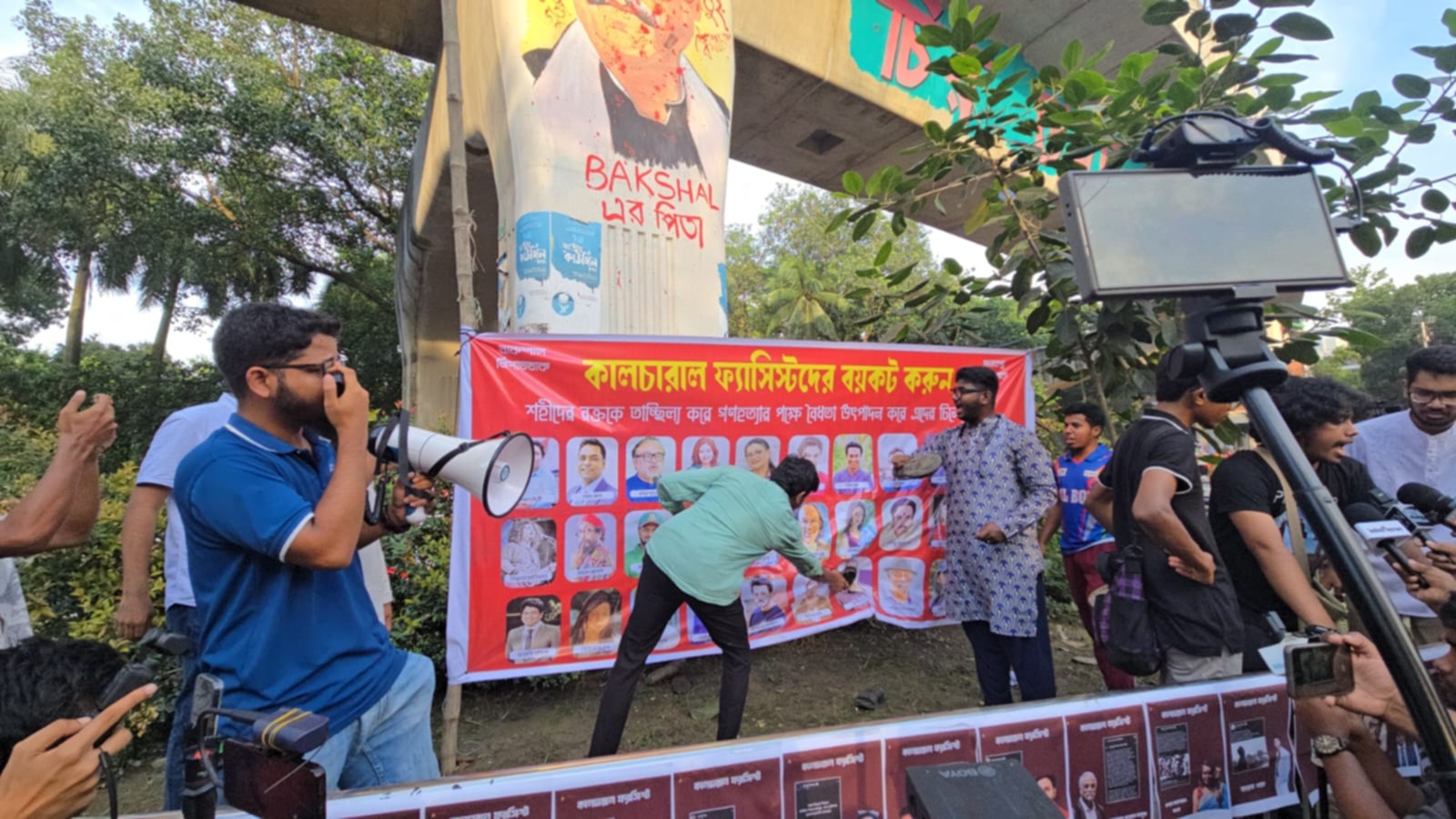 ১৫ আগস্ট শেখ মুজিবুর রহমানকে স্মরণ করে সামাজিক যোগাযোগ মাধ্যমে পোস্ট দেওয়া কিছু শিল্পী, সাংবাদিক ও বিশিষ্টজনকে ‘কালচারাল ফ্যাসিস্ট’ আখ্যা দিয়ে তাদের ছবি-সম্বলিত ব্যানার টানিয়ে সেখানে জুতা নিক্ষেপ কর্মসূচি পালন করেছে কিছু শিক্ষার্থী।
