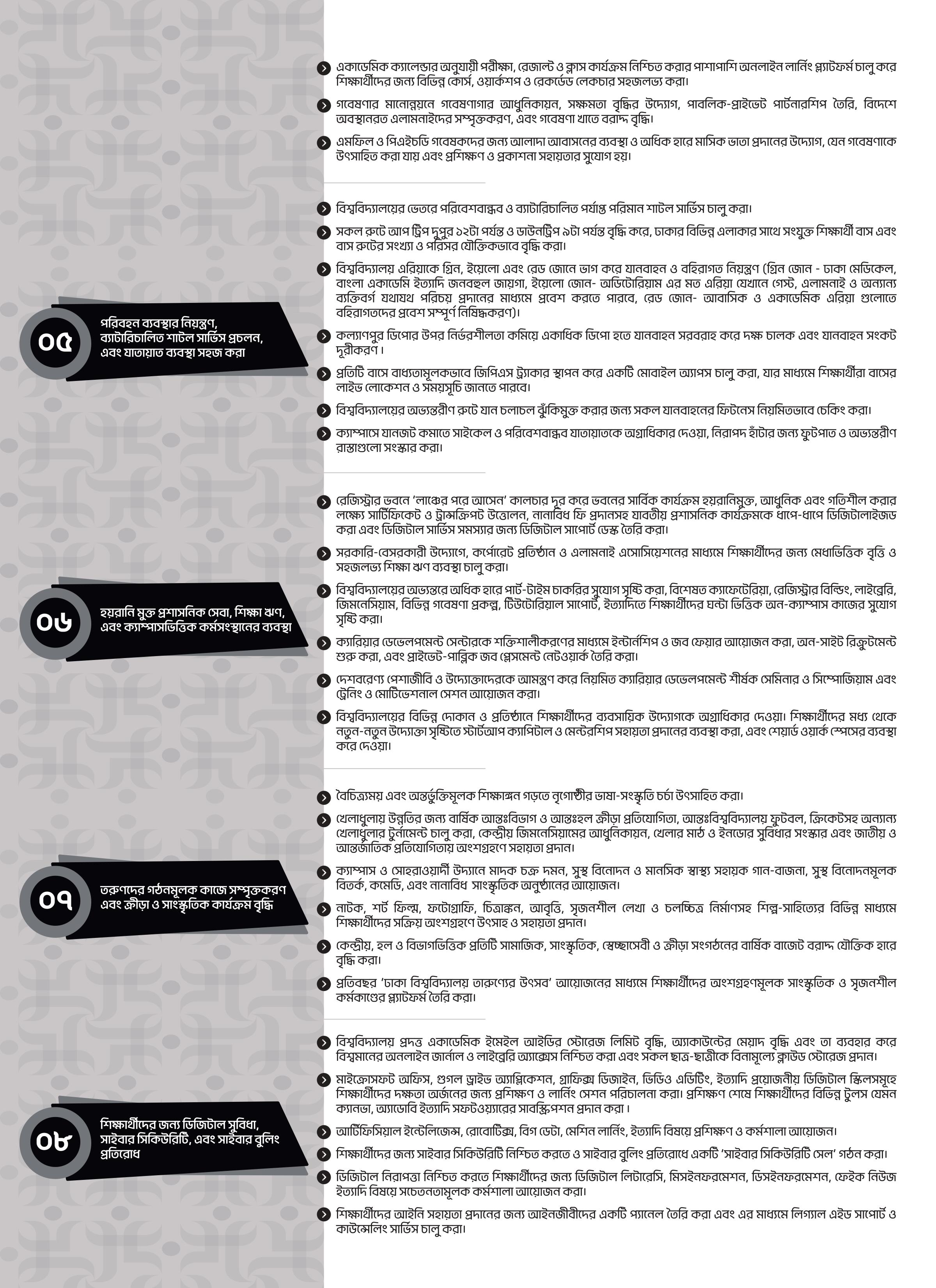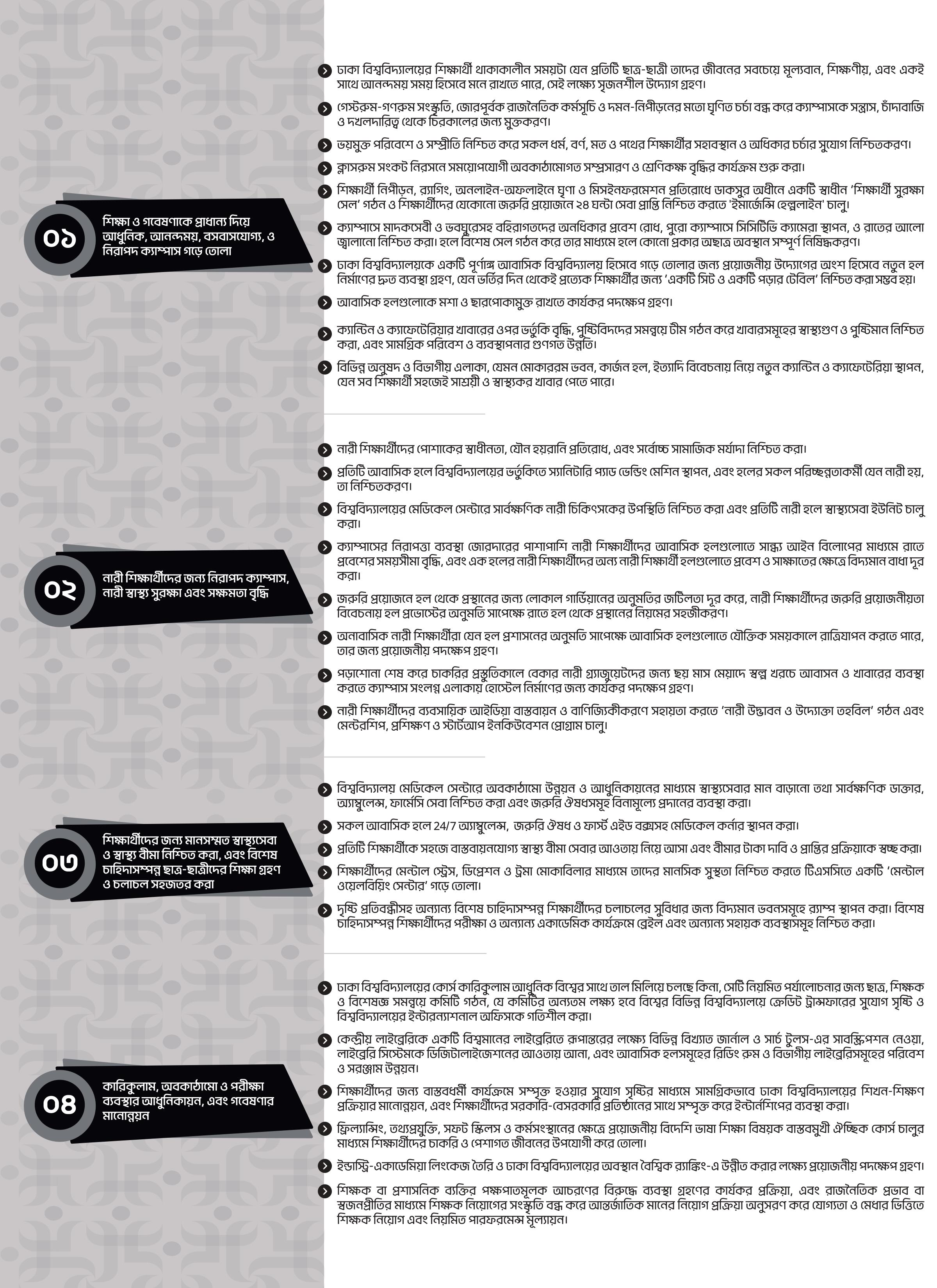 এমফিল ও পিএইচডি গবেষকদের জন্য আলাদা আবাসনের ব্যবস্থা ও ভালো পরিমাণে মাসিক ভাতা প্রদানের উদ্যোগ, যেন গবেষণায় উৎসাহিত করা যায় এবং প্রশিক্ষণ ও প্রকাশনা সহায়তার সুযোগ হয়। বিশ্ববিদ্যালয়ের ভেতর পরিবেশবান্ধব শাটল সার্ভিস চালু করা। সব রুট আপ ট্রিপ দুপুর ১২টা পর্যন্ত এবং ডাউনট্রিপ ৯টা পর্যন্ত বৃদ্ধি করা, ঢাকার বিভিন্ন এলাকার সঙ্গে সংযুক্ত শিক্ষার্থী বাস এবং বাস রুটের সংখ্যা ও পরিসর যৌক্তিকভাবে বৃদ্ধি করা।