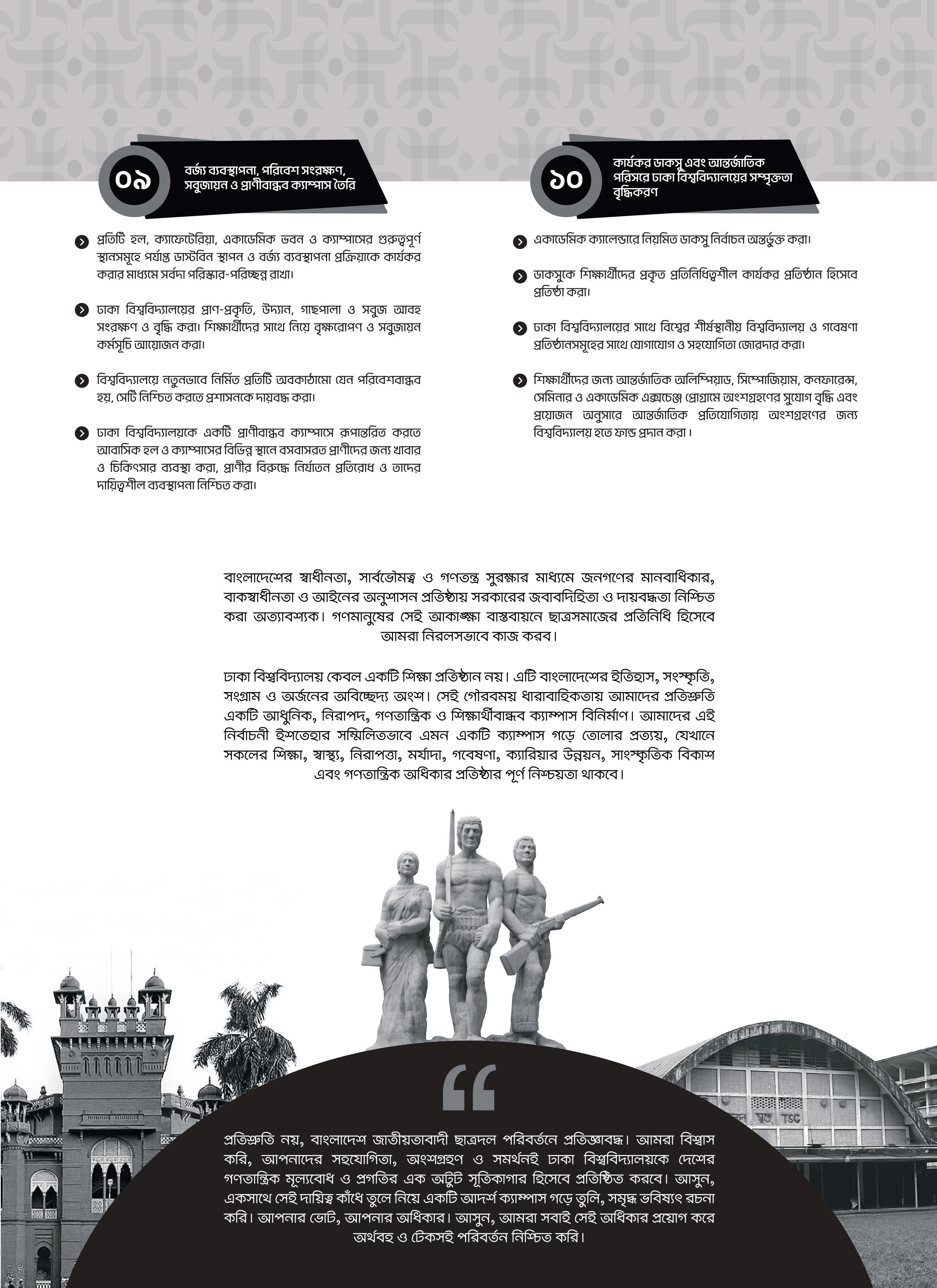 ১০. কার্যকর ডাকসু এবং আন্তর্জাতিক পরিসরে ঢাকা বিশ্ববিদ্যালয়ের সম্পৃক্ততা বৃদ্ধিকরণ