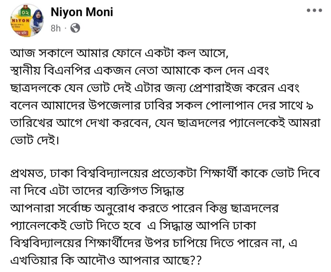 ঢাবির ফরাসি ভাষা ও সংস্কৃতি বিভাগের শিক্ষার্থী নিয়ন মনি এ নিয়ে সামাজিক যোগাযোগ মাধ্যমে একটি পোস্টও দিয়েছেন। তিনি লিখেছেন, আজ সকালে আমার ফোনে একটা কল আসে, স্থানীয় বিএনপির একজন নেতা আমাকে কল দেন এবং ছাত্রদলকে যেন ভোট দেই এটার জন্য প্রেশারাইজ করেন এবং বলেন— আমাদের উপজেলার ঢাবির সব পোলাপানদের সঙ্গে ৯ তারিখের আগে দেখা করবেন, যেন ছাত্রদলের প্যানেলকে আমরা ভোট দেই।