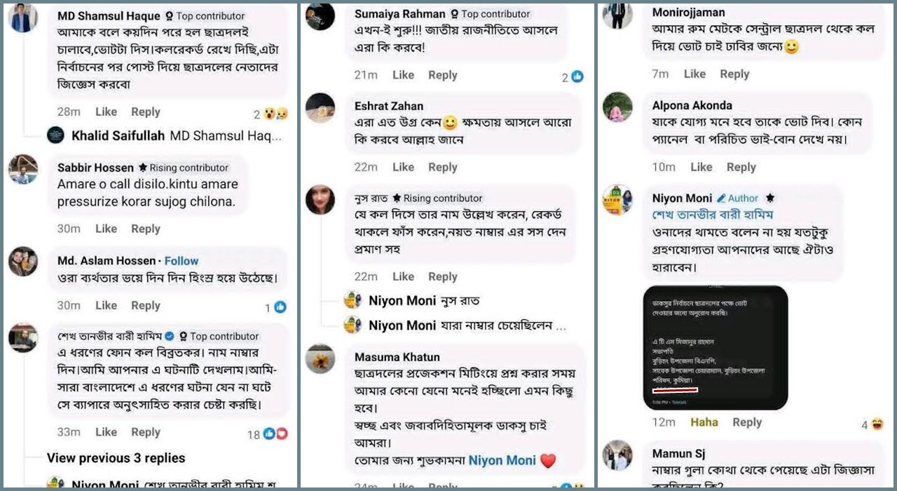 ঢাবি শিক্ষার্থী আরমান হোসেন বলেন, চাঁদপুর জেলা ছাত্রদলের পক্ষ থেকে মাগরিবের ঠিক আগ মুহূর্তে আমাকেও কল দিয়েছিল। ৪ মিনিটের ফোনালাপে আমি বোঝানোর চেষ্টা করেছি— এভাবে কল দিলে ফলাফল হিতে বিপরীত হবে। অথচ সে উল্টো বলল— ভোট দিলে এলাকায় সুবিধা পাবেন।