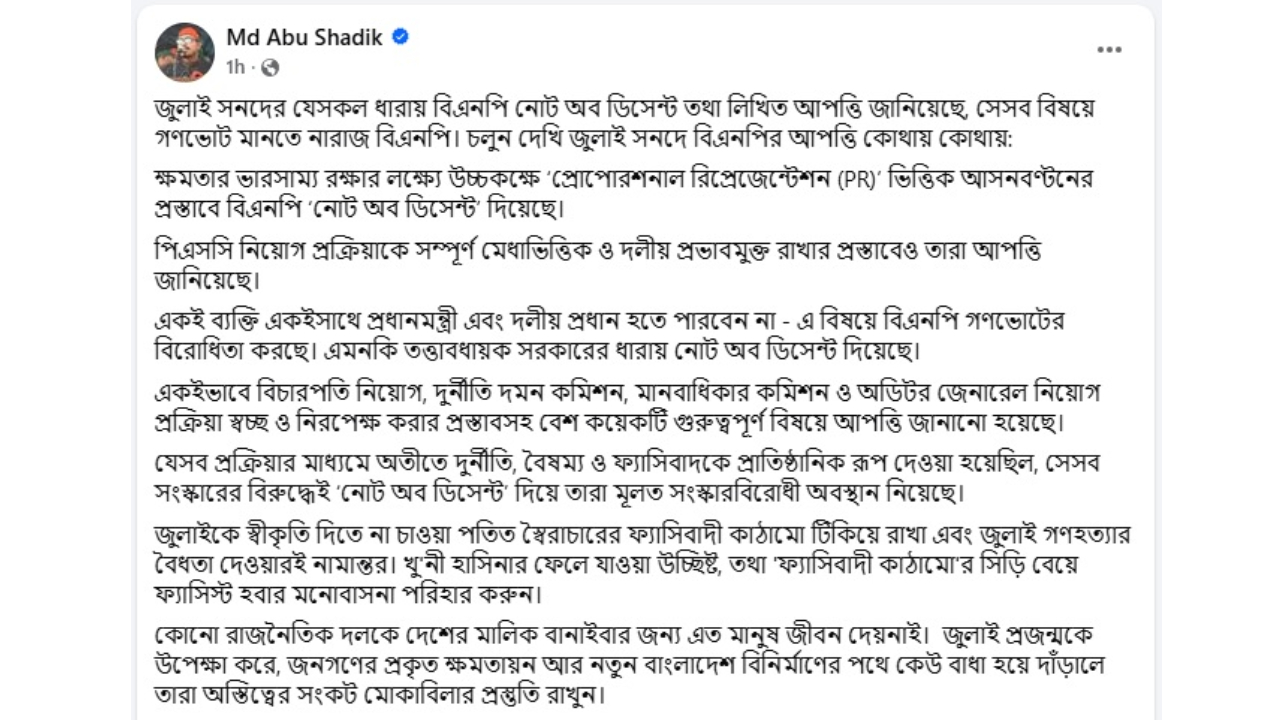 ফেসবুক বার্তায় সাদিক কায়েম লিখেছেন, জুলাই সনদের যেসকল ধারায় বিএনপি নোট অব ডিসেন্ট তথা লিখিত আপত্তি জানিয়েছে, সেসব বিষয়ে গণভোট মানতে নারাজ বিএনপি। চলুন দেখি জুলাই সনদে বিএনপির আপত্তি কোথায় কোথায়-