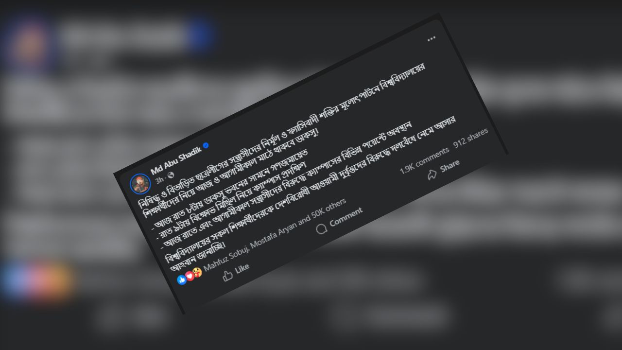বুধবার (১২ নভেম্বর) ডাকসুর ভিপি আবু সাদিক কায়েম এক ফেসবুক পোস্টে এ কর্মসূচির ঘোষণা দিয়েছেন।