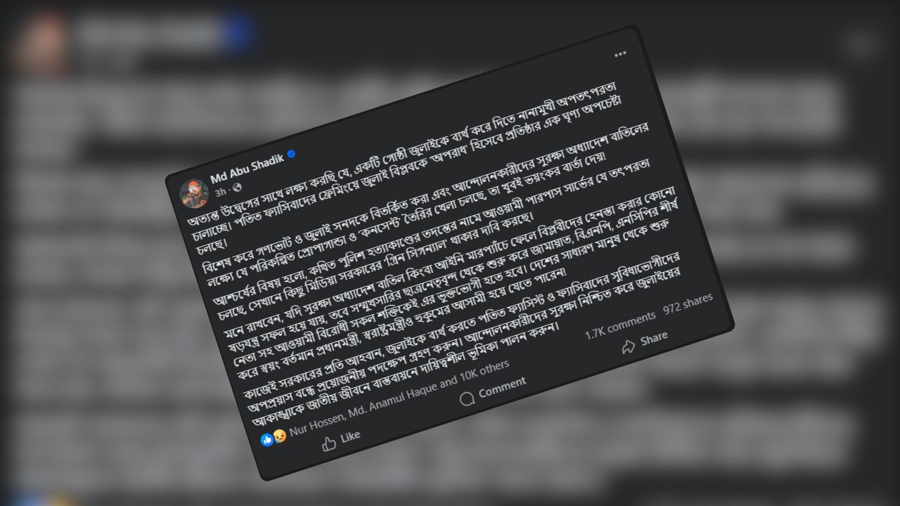 স্ট্যাটাসে সাদিক কায়েম লেখেন, ‘অত্যন্ত উদ্বেগের সাথে লক্ষ্য করছি যে, একটি গোষ্ঠী জুলাইকে ব্যর্থ করে দিতে নানামুখী অপতৎপরতা চালাচ্ছে। পতিত ফ্যাসিবাদের ফ্রেমিংয়ে জুলাই বিপ্লবকে ‘অপরাধ’ হিসেবে প্রতিষ্ঠার এক ঘৃণ্য অপচেষ্টা চলছে। বিশেষ করে গণভোট ও জুলাই সনদকে বিতর্কিত করা এবং আন্দোলনকারীদের সুরক্ষা অধ্যাদেশ বাতিলের লক্ষ্যে যে পরিকল্পিত প্রোপাগান্ডা ও ‘কনসেন্ট’ তৈরির খেলা চলছে, তা খুবই ভয়ংকর বার্তা দেয়!’