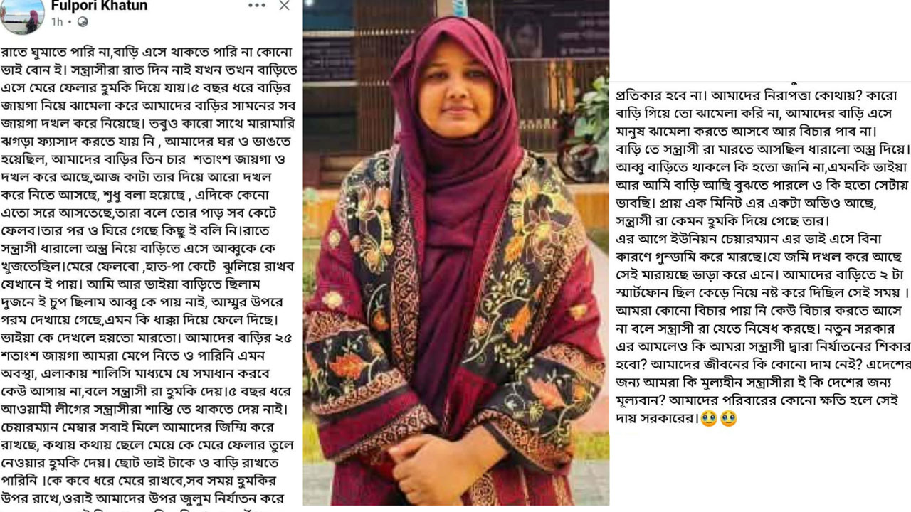 ফুলপুরী খাতুন আরও লিখেছেন, রাতে ঘুমাতে পারি না, বাড়িতে এসে থাকতে পারি না কোনো ভাইবোনই। সন্ত্রাসীরা রাত দিন নাই যখন তখন বাড়িতে এসে মেরে ফেলার হুমকি দিয়ে যায়। ৫ বছর ধরে বাড়ির জায়গা নিয়ে ঝামেলা করে আমাদের বাড়ির সামনের সব জায়গা দখল করে নিয়েছে। আজ কাঁটাতার দিয়ে আরও দখল করে নিতে আসছে। রাতে সন্ত্রাসীরা ধারালো অস্ত্র নিয়ে বাড়িতে এসে আব্বুকে খুঁজতেছিল। মেরে ফেলবো, হাত-পা কেটে ঝুলিয়ে রাখবো যেখানেই পায়। আব্বুকে পায় নাই, আম্মুর ওপরে গরম দেখায়ে গেছে, এমন কি ধাক্কা দিয়ে ফেলে দিছে।