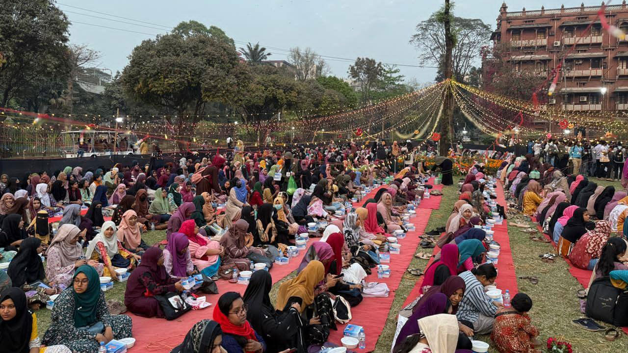 রোববার (১ মার্চ) বিশ্ববিদ্যালয়ের কার্জন হল প্রাঙ্গণে এ গণ ইফতার অনুষ্ঠিত হয়। ইফতার মাহফিলকে ঘিরে নারী শিক্ষার্থীদের প্রাণবন্ত উপস্থিতিতে মুখর হয়ে ওঠে কার্জন হল প্রাঙ্গণ।