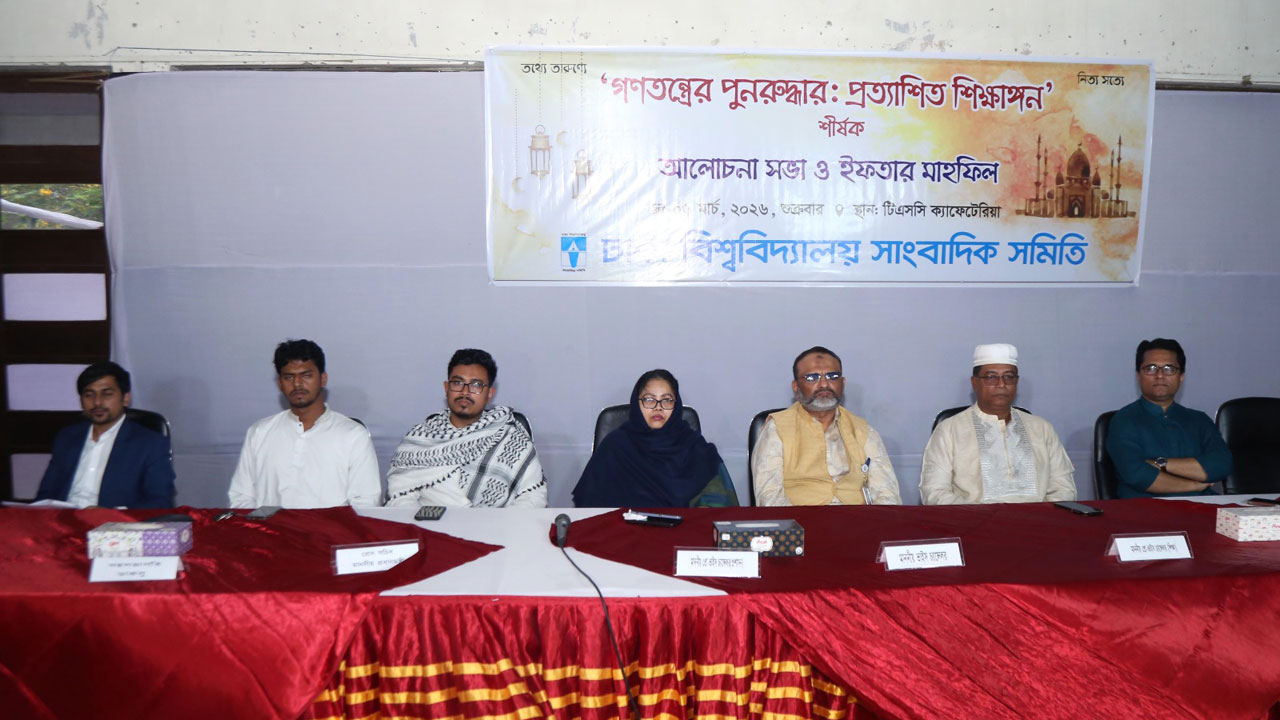 শুক্রবার (৬ মার্চ) বিশ্ববিদ্যালয়ের ছাত্র-শিক্ষক কেন্দ্র (টিএসসি) মিলনায়তনে ‘গণতন্ত্রের পুনরুদ্ধার : প্রত্যাশিত শিক্ষাঙ্গন’ শীর্ষক আলোচনা সভা ও ইফতার মাহফিল অনুষ্ঠিত হয়। ঢাকা বিশ্ববিদ্যালয় সাংবাদিক সমিতির সভাপতি মহিউদ্দিন মুজাহিদ মাহির সভাপতিত্বে এবং সাধারণ সম্পাদক মাহাদি হাসানের সঞ্চালনায় অনুষ্ঠানটি পরিচালিত হয়।