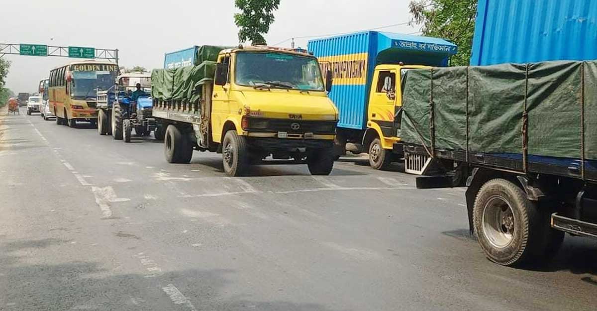 বৃহস্পতিবার (৩১ মার্চ) বেলা ১১টা থেকে দুপুর ৩টা পর্যন্ত দৌলতদিয়া ঘাটে সরেজমিনে দেখা যায়, ফেরিঘাটের জিরো পয়েন্ট থেকে ঢাকা-খুলনা মহাসড়কের পদ্মার মোড় পর্যন্ত ৫ কিলোমিটার এলাকায় ৫ শতাধিক পচনশীল ও অপচনশীল পণ্যবাহী ট্রাকের সারি তৈরি হয়েছে।