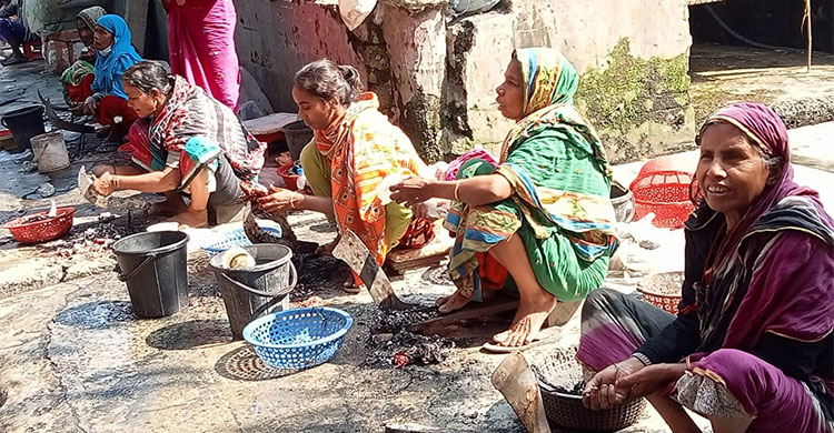 আলিয়া বিবি বলেন, স্বামী তিন বছর আগে বিয়ে করে এক সন্তানসহ আমাদের ফেলে চলে গেছেন। পরে মানুষের বাসায় কাজ করা শুরু করি কিন্তু মাসে মালিক যা টাকা দেয়, তা দিয়ে আমাদের চলে না। তাই বাধ্য হয়ে পেটের দায়ে মাছ কুটা কাজ করছি।