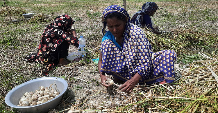 সরেজমিনে মাঠে গেলে দেখা যায়, পুরুষরা রসুন ওঠাচ্ছেন। নারীরা তা কেটে দিচ্ছেন। কথা হয় হনুফা বিবির সঙ্গে। তিনি বলেন, এবার মাঠে গাছ হয়েছে ভালো। কিন্তু রসুনের আকার ছোট হয়েছে। আগে আমরা দিনে ৪ থেকে ৫ মণ রসুন কাটতে পারতাম। আর এখন ২ মণ রসুন কাটতে অনেক কষ্ট হয়ে যায়। ছোট হওয়ার কারণে কেটে আয় পাওয়া যায় না।