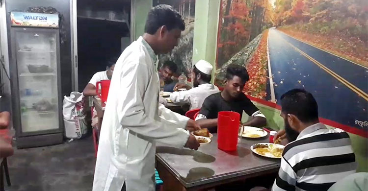 সরেজমিনে ভেতরে ঢুক দেখা গেল রফিকুল নিজ হাতে ও তার হোটেলের কর্মচারীররা ইফতারি ও সাহরির খাবার পরিবেশন করছেন। তারা সাহরির আইটেমে ছিল গরুর মাংস, মাছ, শাকভাজা। এ সময় জানান, ইফতারিতে থাকে ছোলা বুট, বুন্দা, মুড়ি, পেঁয়াজু, বেগুনি, শরবত। এসব খেয়ে রোজাদাররা তৃপ্ত হন। তারপর তারা দোয়া করেন।