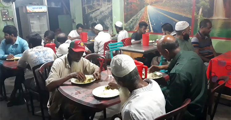 হোটেলের ভেতরে ঢুকে দেখা গেল সব চেয়ারে বসে খাবার খাচ্ছে লোকজন। এদিকে খাবার পরিবেশনকারীরাও মহাব্যস্ত। খালি নেই কারও হাত। কেউ এসে দিচ্ছেন ভাত, কেউ দিচ্ছেন তরকারি। হোটেলজুড়ে জমজমাটভাবে চলছে সাহরিপর্ব।