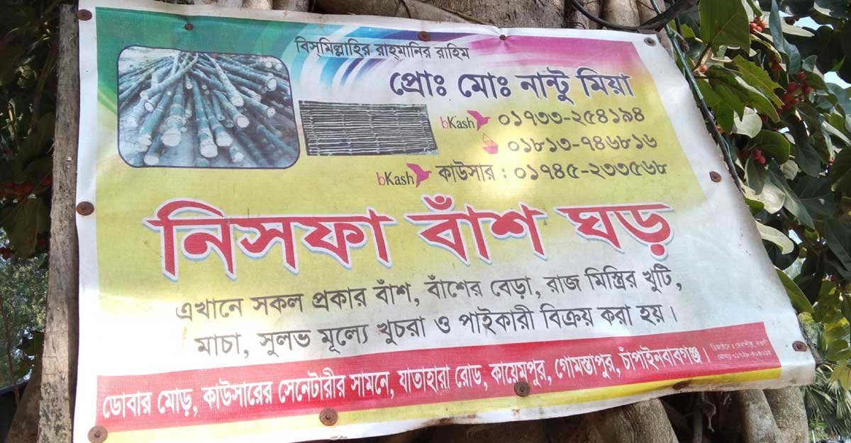 চাঁপাইনবাবগঞ্জের গোমস্তাপুর উপজেলার কায়েমপুর ডোবারমোড়ে সব ধরনের বাঁশ, বাঁশের বেড়া, নির্মাণকাজে ব্যবহৃত বাঁশের খুঁটি বিক্রি করে নিসফা বাঁশ ঘর। আশপাশের গ্রামের বিভিন্ন সড়কজুড়ে রয়েছে তাদের প্রচারণামূলক ফেস্টুন। রাস্তার দুই ধারের গাছে লাগানো এসব ফেস্টুনে দেওয়া হয়েছে পেরেক। নিসফা বাঁশ ঘরের মতোই স্থানীয় বালু ও খোয়া ব্যবসায়ীরা তাদের ব্যবসার প্রচারণা চালাতে ব্যবহার করেছে রাস্তার ধারের গাছে লাগানো পেরেকযুক্ত ব্যানার।