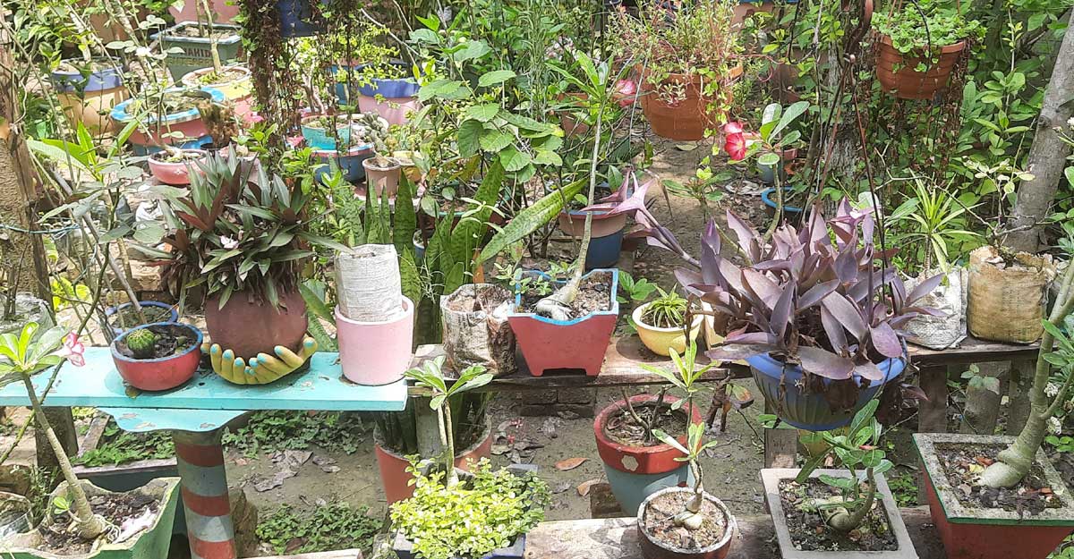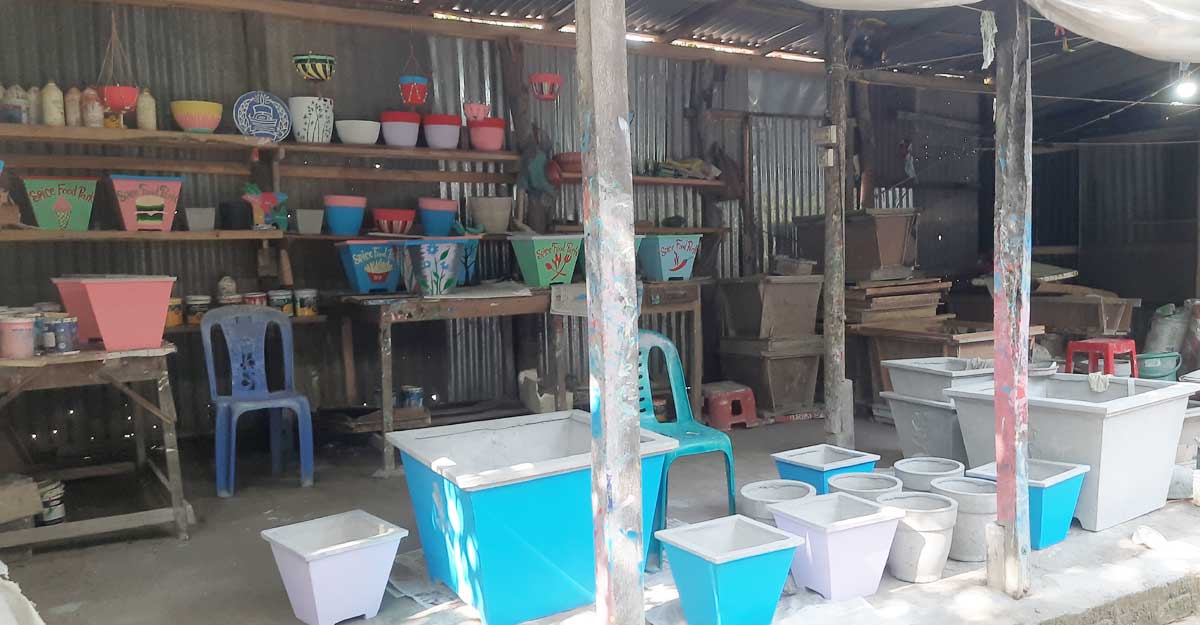 সরেজমিনে ঘুরে দেখা যায়, ঘরের সামনের উঠানে একটি নার্সারি। এতে রয়েছে হরেক রকমের ফলজ, ঔষুধি ও ঘরের সৌন্দর্য বর্ধনকারী গাছ। সকাল-বিকেল মানুষ আসছে নার্সারি দেখতে। ঘরের পাশে ছোট একটি চৌচালা করে বানানো হয়েছে টবের কারখানা। রয়েছে বিভিন্ন সাইজের টব বানানোর ডাইস। নিয়মিত টব বানানোর কাজ করছেন শ্রমিকরা। পাশেই চেয়ারে বসে কাজ করছে বিভিন্ন কলেজের শিক্ষার্থীরা। তারা আর্ট করছে টবগুলোতে। ক্রেতারা যে রকমের চিত্র চাচ্ছেন তা টবে অঙ্কন করা হচ্ছে।
