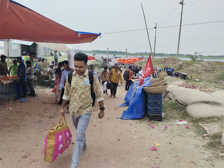 ঢাকা ও আশপাশের বিভিন্ন জেলা থেকে নানাভাবে মুন্সীগঞ্জের শিমুলিয়ায় ভিড় করছে মানুষ। লঞ্চ ও স্পিডবোটে গাদাগাদি করেই তারা পদ্মা নদী পার হচ্ছেন। বাংলাবাজার ঘাটে আসার পরেই যাত্রীরা কিছুটা স্বস্তি পাচ্ছেন। ঘাট এলাকায় আইনশৃঙ্খলা রক্ষাকারী বাহিনীর তৎপরতা থাকায় পরিস্থিতি অনেকটাই স্বাভাবিক।