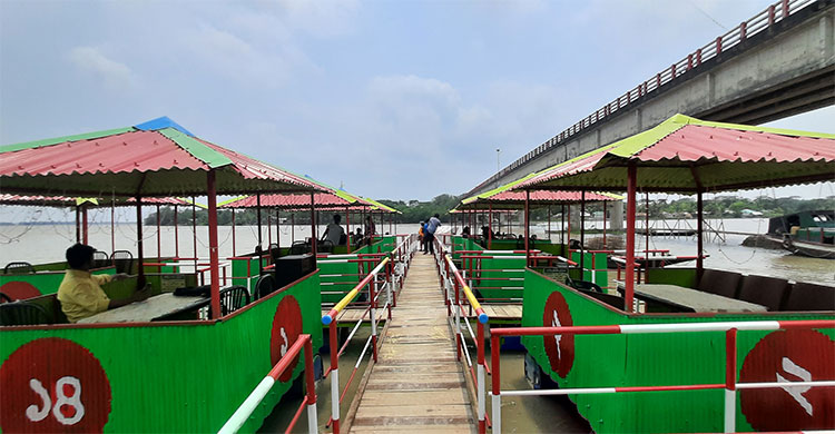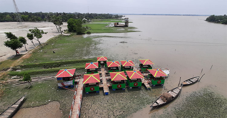 নদীতে স্রোত বইছে, সঙ্গে বাতাস। তীরে গড়ে ওঠা চরে ধীরে ধীরে বাড়ছে পানি, করছে ছুঁইছুঁই। এর সঙ্গে মাটি আঁকড়ে ধরে থাকা ১০০ প্লাস্টিকের ড্রাম ভেসে উঠছে। আর ড্রামের ওপর গড়ে তোলা সুসজ্জিত ১০ কক্ষবিশিষ্ট একটি রেস্টুরেন্টও ভেসে উঠছে পানির ওপর। মাঝেমধ্যে বাতাস বইলে বা নদীতে জলযান গেলে সৃষ্ট ঢেউয়ে দোল খাচ্ছে। মুহূর্তের মধ্যে শুকনা চরের বালু নদীর জোয়ারের পানিতে লুকিয়ে গেল।